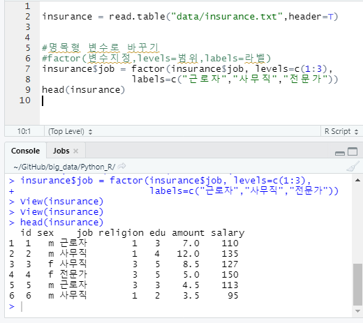ex. job 1-> 근로자, 2 -> 사무직 3-> 전문가
