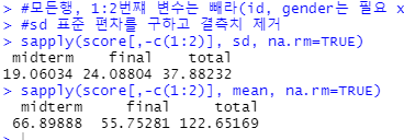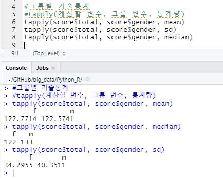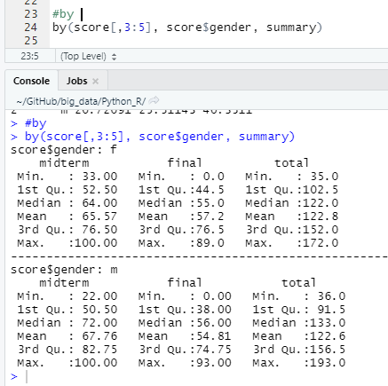 - by(데이터프레임, 그루핑 변수, 통계량 or summary)