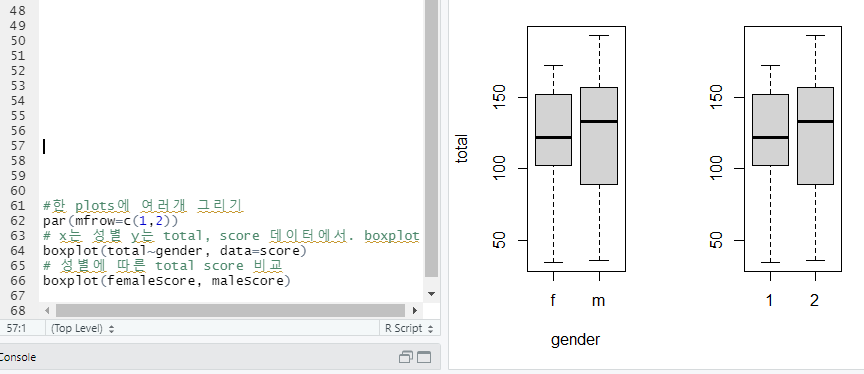 - par(mfrow=c())로 한 페이지에 여러개 그릴수 있음