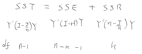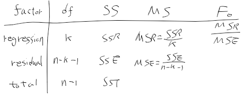 - 유의수준 alpha에서 F0 > F(k, n-k-1;alpha) 인 경우 귀무가설을 기각 => 회귀방정식이 유의
