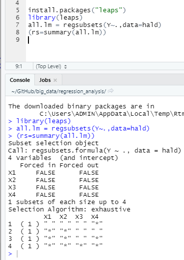 - 독립변수가 k개 있으면 2^k -1 개의 회귀모형을 다뤄보자