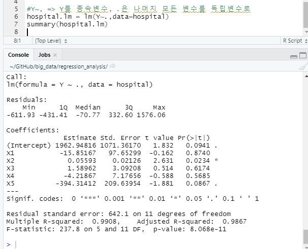 - X4 병원가능인구가 늘어날수록, 근무시간 Y는 늘어나야하나 -4.219가 나옴.
