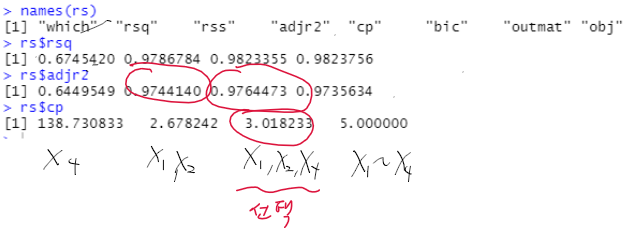 - 아래의 통계량을 정리해보면 X1, X2, X4가 사용된경우 조정된 R2가 가장 크고