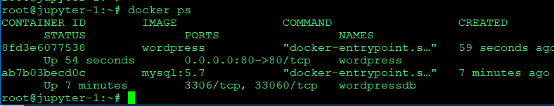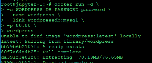 docker run -d -e WORDPRESS_DB_PASSWORD=password --name wordpress --link wordpressdb:mysql -p 80:80 wordpress