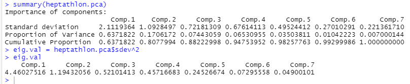 - 변수가 7개이므로, 7개의 주성분을 구하고, 각 주성분의 표준 편차 출력