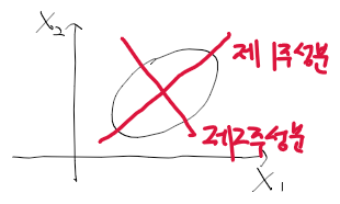 - 분산이 큰 방향이 제 1주성분, 분산이 작은 부분이 제2주성분임.