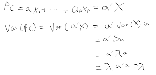 - 주성분 분석은 표본 공분산 행렬 S의 고유값과 고유벡터를 이용하여 분산 중심 분석법.