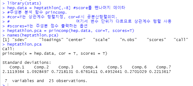 - stats 라이브러리의 princomp 함수 사용