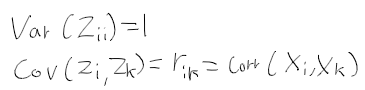 - 표준화 후 표준화 변수 벡터 Z에 대해 분산은 1, 공분산은 상관계수가 됨.
