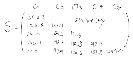 - 아래는 학생들의 다섯 과목 시험 점수에 대한 표본 공분산 행렬 S