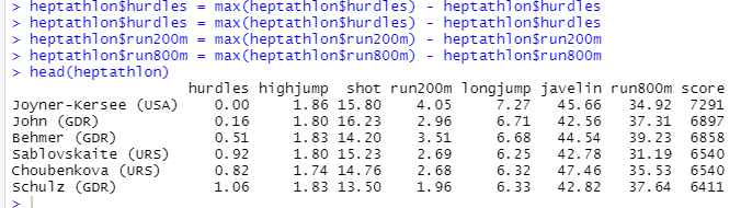 - hurdles, run200m, run800m은 값이 작을수록 좋으므로 변형