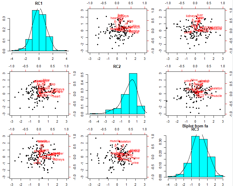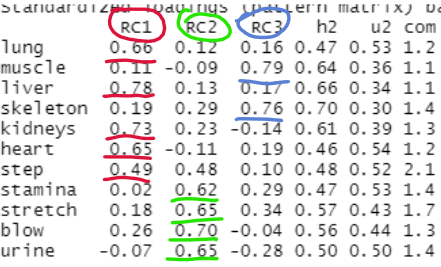 - 세번째 인자 RC3는 muscle과 skeleton이 높은 값 => 근육골