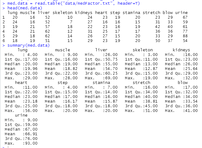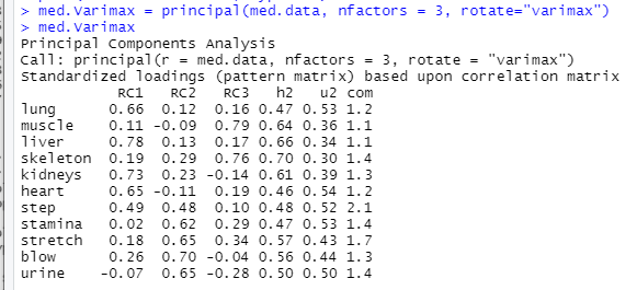 - 첫번째 인자 RC1은 lung, liver, kidney, heart가 가장 높은 값을 가짐. => 생물 의학