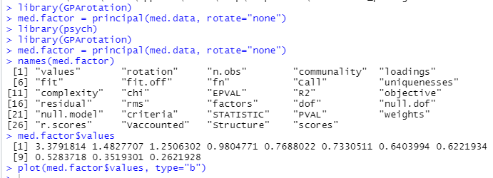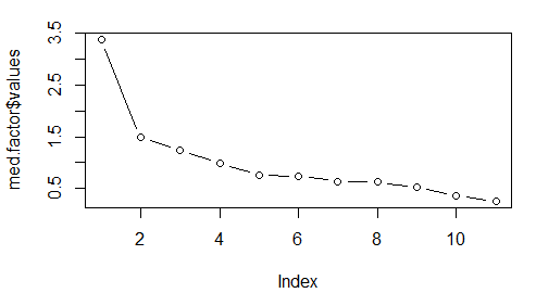 - values는 고유값. 고유값을 보면 세번재 인자까지 1이상임을 알 수 있음.