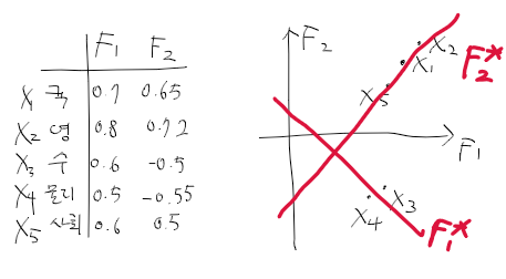 => 인자 F1는 분석력, F2는 이해력이라 정의할 수 있음.